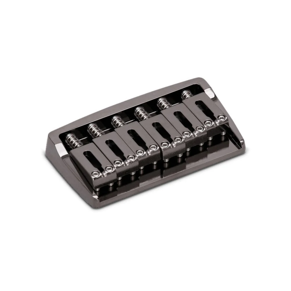 This new luxurious Gotoh fixed bridge combines steel block saddles with a base plate made from a solid brass block and shaped using CNC machining. Available in chrome, cosmo (black chrome), black or gold finishes. Includes 3 mounting screws and allen key to adjust saddle height.