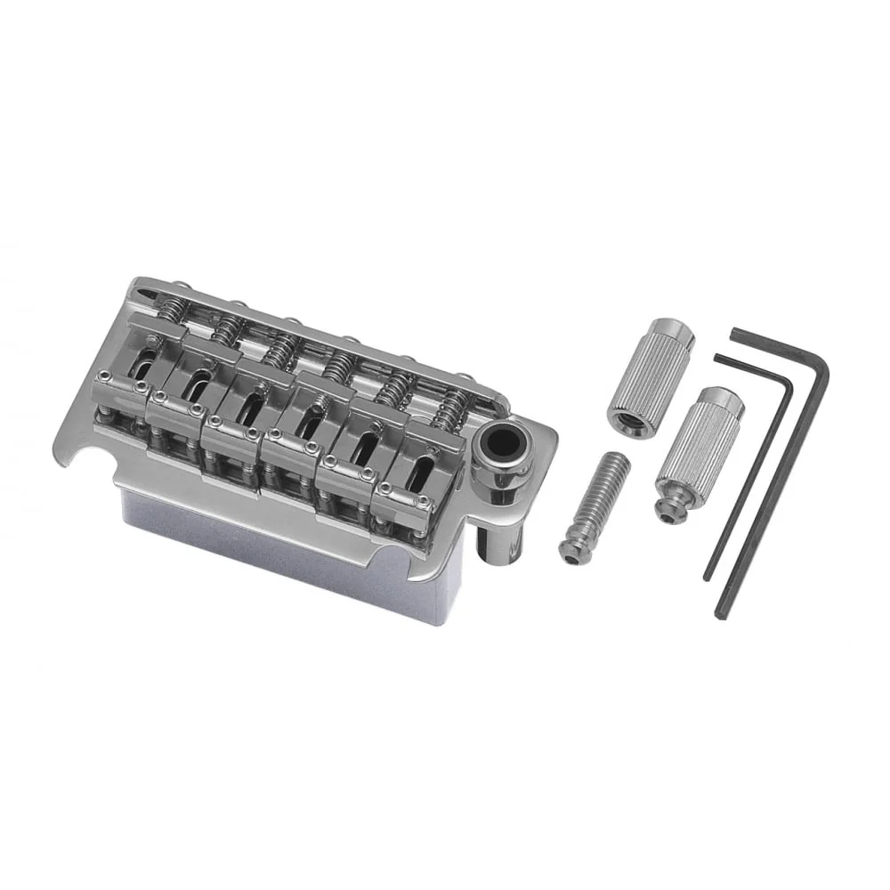 Gotoh contemporary tremolo bridge unit with vintage steel saddles with a solid steel block. Two pivot fulcrum mount. Allen keys, springs, spring claw with screws, arm, mounting posts and inserts are all included. Resilient chromium molybdenum steel base plate and high-grade heat treatment with Gotoh's precision machining all equal up to one of the highest quality tremolo units on the market today. ‚