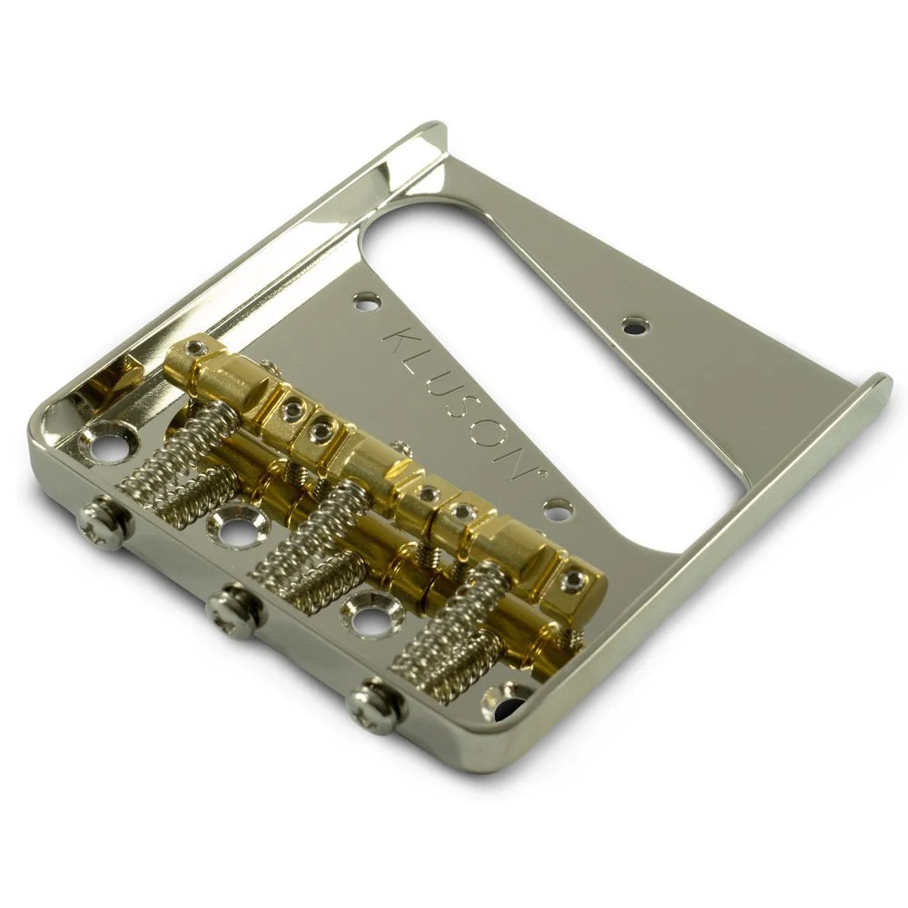 Kluson introduces the new vintage Tele bridge specifically designed for Telecasters with vintage bridge specification requirements. This superior quality bridge has a stamped steel baseplate with compensated brass saddles but with higher quality finish work compared to originals. Every bridge comes complete with the mounting screws and allen key to adjust the height of the 3 brass barrel saddles. These bridges feature string holes in the underside of the bridge plate to allow for through-body stringing only.