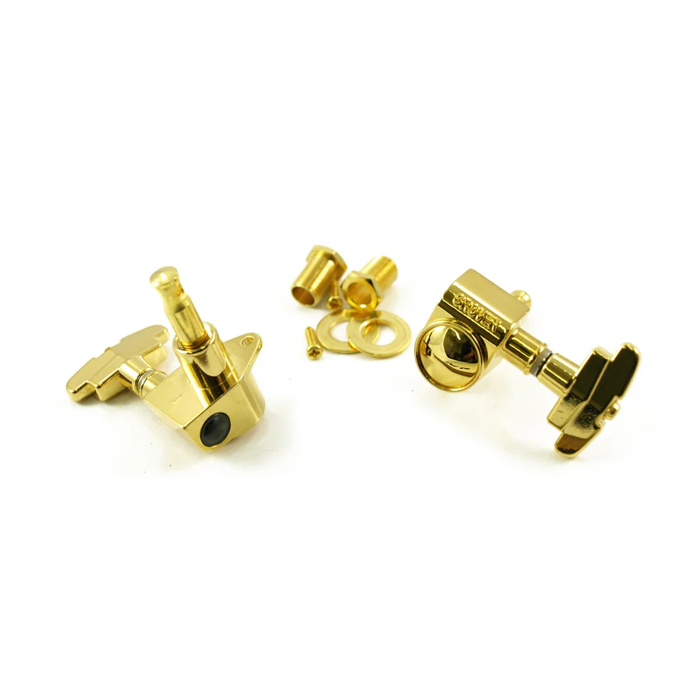 Grover®, Super Rotomatics, 14:1 gear ratio, sold as a set of 6. Includes washers, wood screws and bushings. With 3 step button. The housing provides a maximum bearing for worm, gear and string post. Worm and gear are precison cut for perfect meshing. This eliminates backlash and slippage. Gear box has a special lubricant for lifetime, trouble free service.