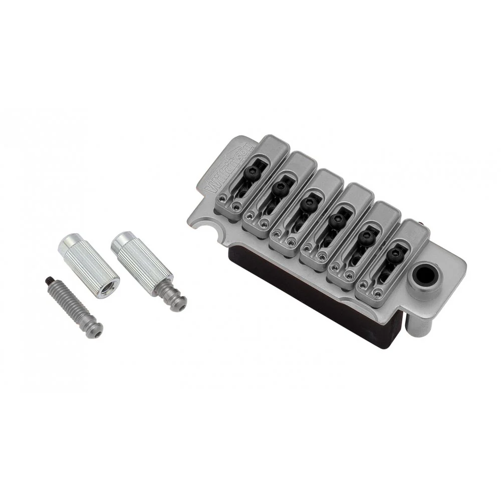 Gotoh Wilkinson, VS100N Tremolo System. The VS100N has become an industry standard that all other trem systems are judged by. They are used by many professional guitar Luthiers and can be found on many of the high-end instruments on the market. Unsurpassed for performance and tuning stability without the need for a mechanics tool kit to change strings! A precision machined hardened steel base plate with stainless steel saddles give years of use and abuse without failing you. ‚ The sustain block is made from zinc diecast. The saddles are locked down to the baseplate, allowing the full transfer of the string vibrations into the whole bridge and increasing sustain. Also includes a stainless steel arm that is held in with a collar allowing for tension adjustment. Mounting posts with body inserts, springs, claw with screws, tremolo arm and allen keys are all included.